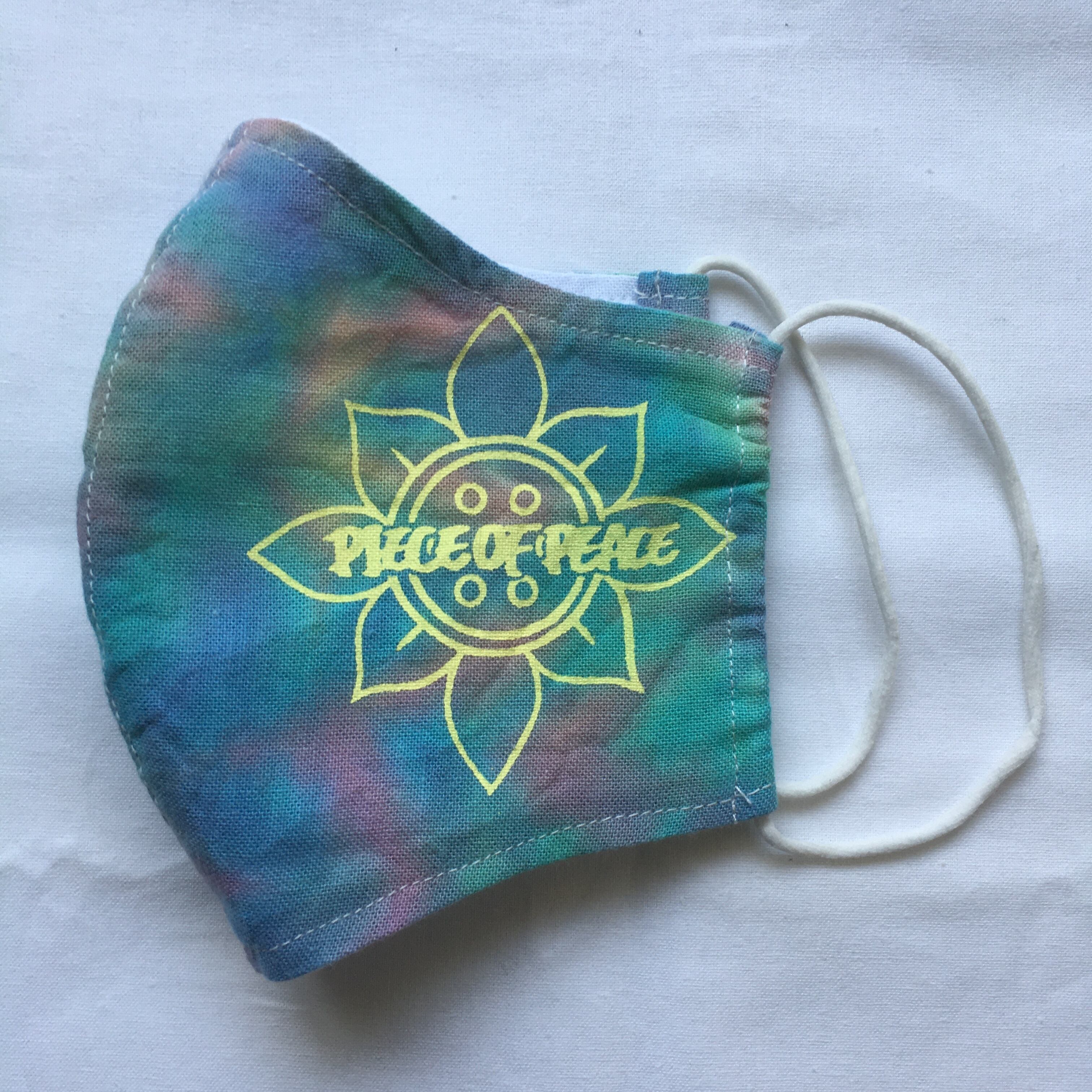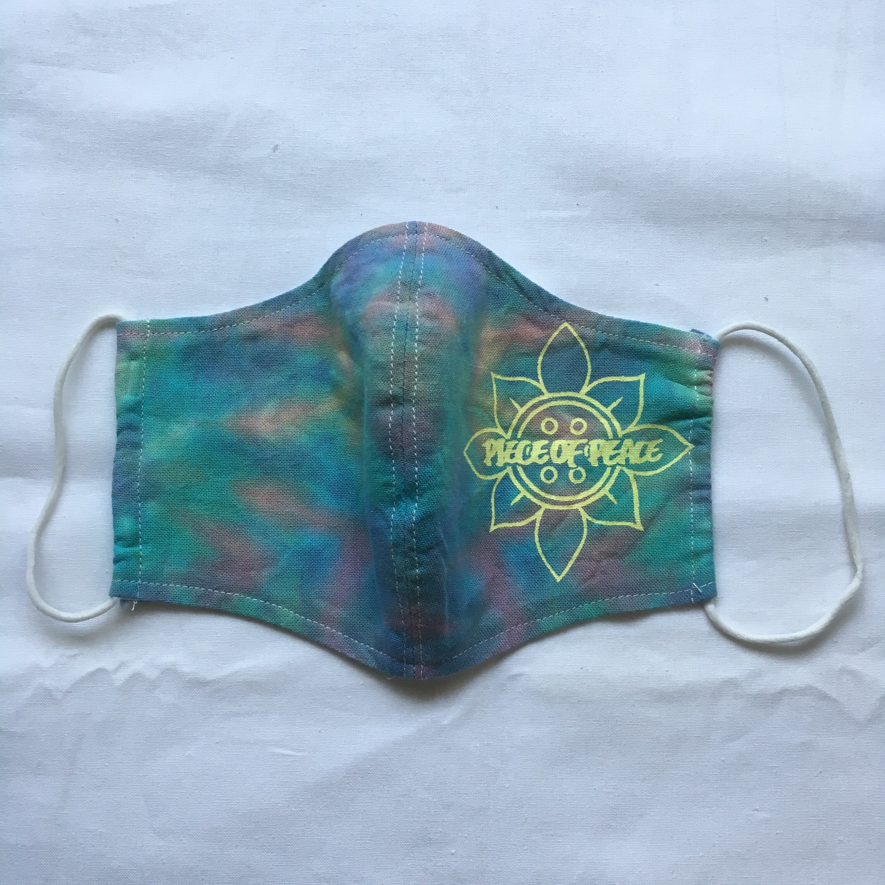 手拭いをタイダイで染め、ブランドロゴをシルクスクリーンプリントしたマスク。1つ1つ手づくりのため写真の商品と多少異なることがあります、ご了承下さい。